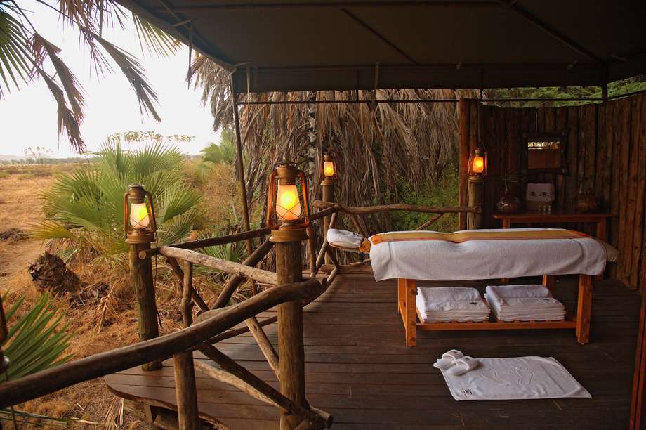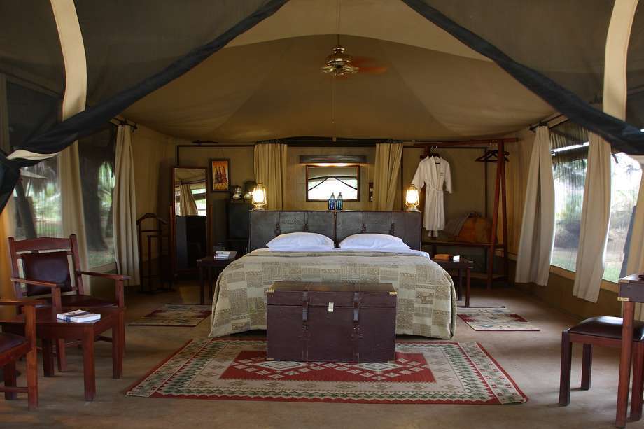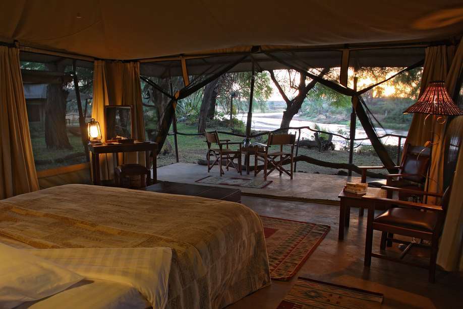 Les 20 tentes sont discrètement situées face à la rivière Ewaso Nyiro (à l’exception d’une située en retrait) et offrent une vue imprenable. Vastes et très confortables, elles sont décorées avec goût. Elles sont dotées d’un coin salon, d’un bureau, d’un ventilateur, d’un dressing, d’un coffre et d’une salle de bain équipée. Baignées de lumière au lever du soleil, chaque tente se dresse sur un socle en pierre naturelle.