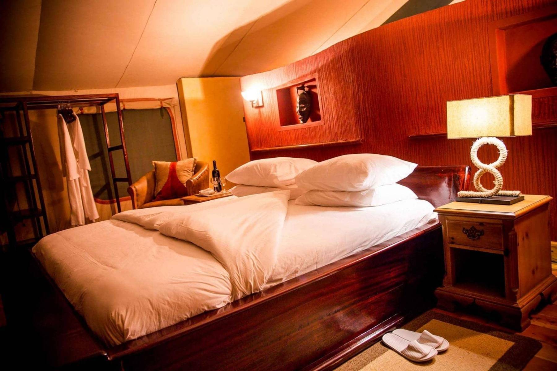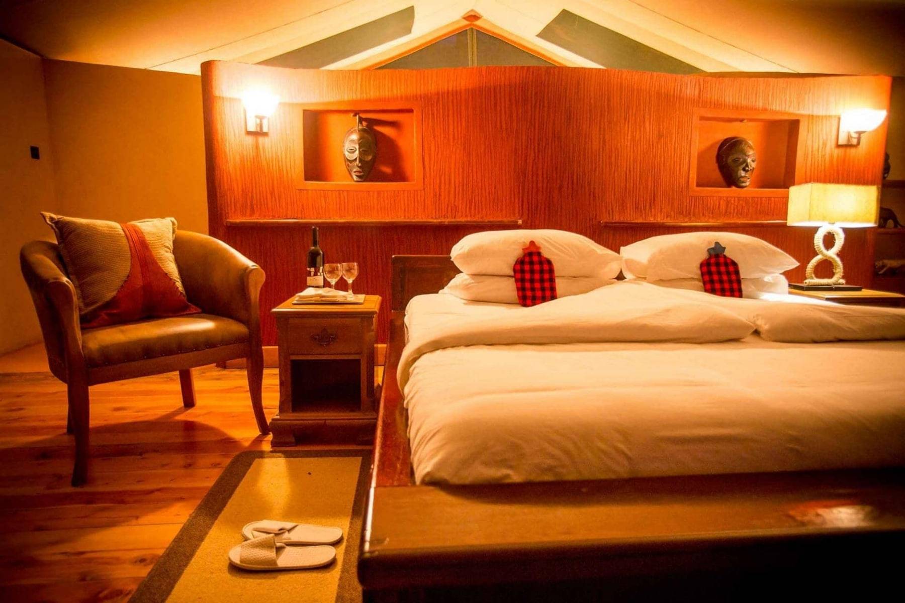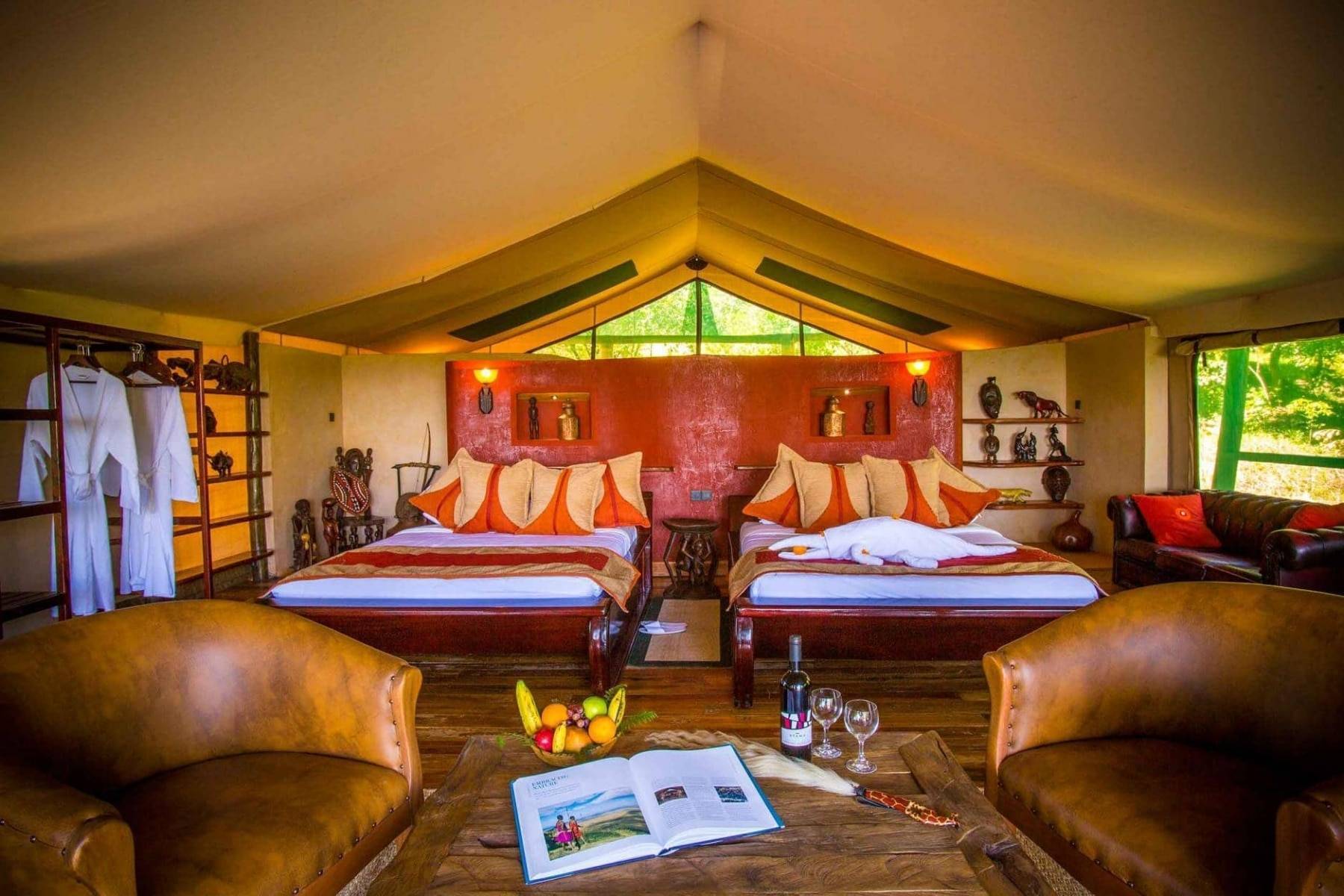 Ses tentes sont aménagées de façon luxueuse. Elles sont spacieuses et disposent d’un balcon donnant sur la forêt ou le Masai Mara. Les salles de bains privatives sont pourvues d’une douche à effet pluie et d’une coiffeuse double. Des chaussons, des peignoirs et des articles de toilette sont fournis.