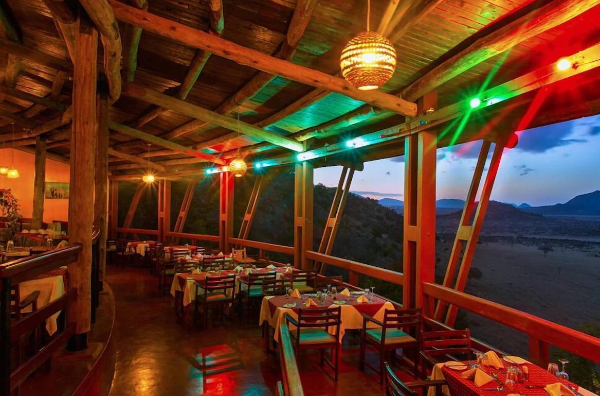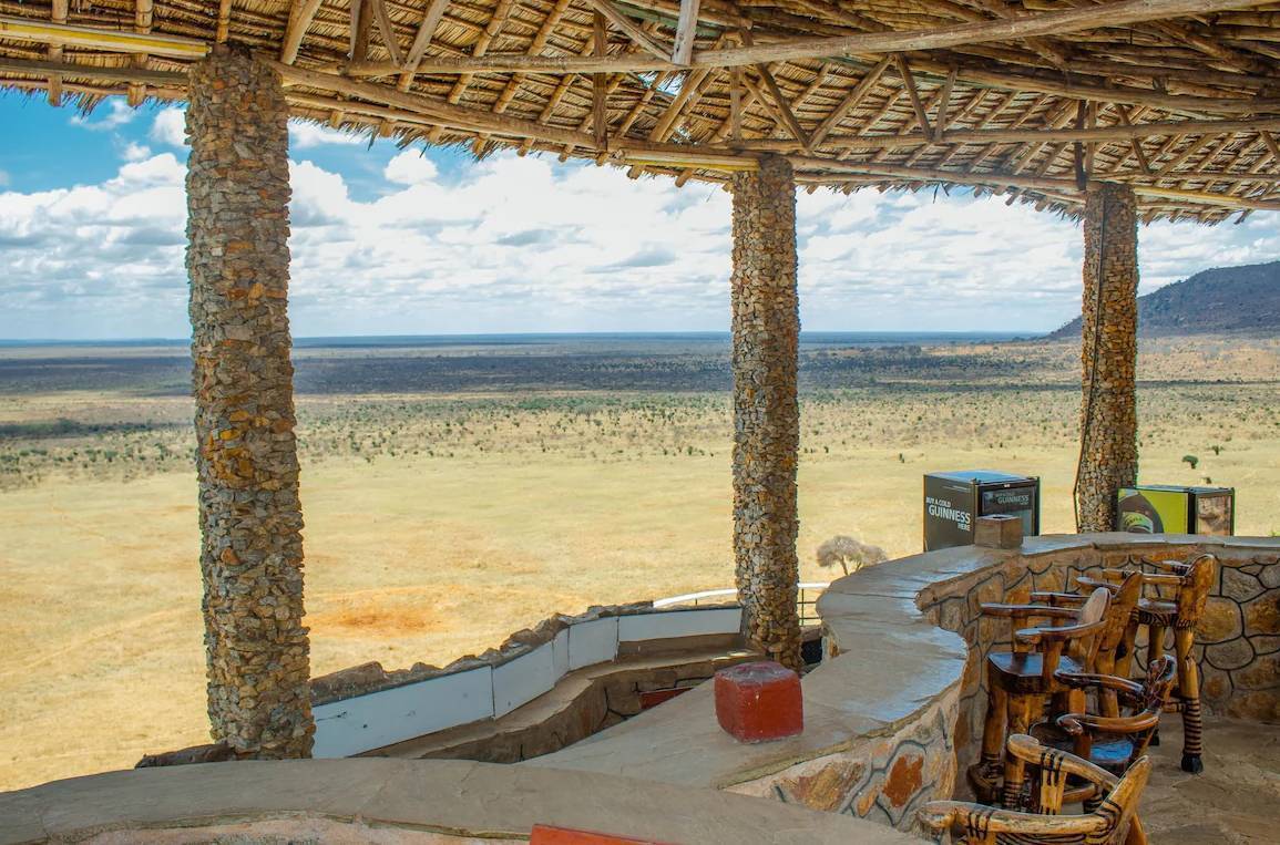 Le restaurant surplombe les immenses plaines de Tsavo et offre une vue sur un point d’eau situé en contre-bas. Les repas sont servis sous forme de buffet ou sont proposés en menus. Des éléphants, des girafes et autres se baladent juste sous vos pieds pendant que vous profitez de la piscine. Du pur bonheur !!